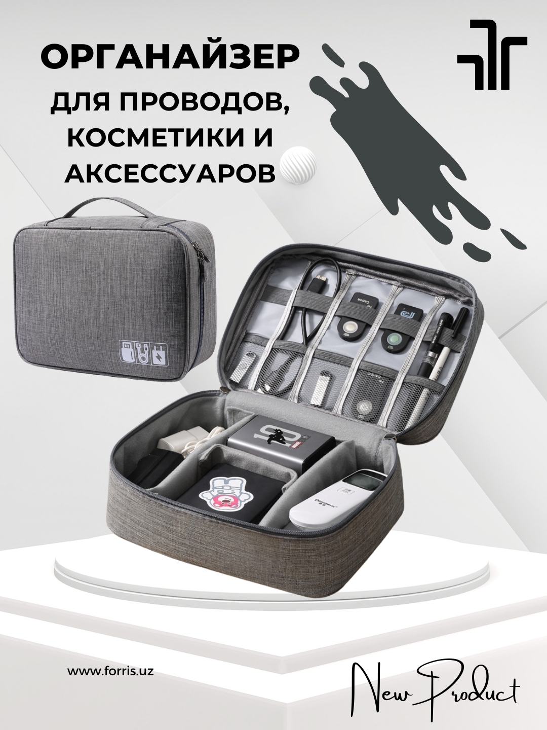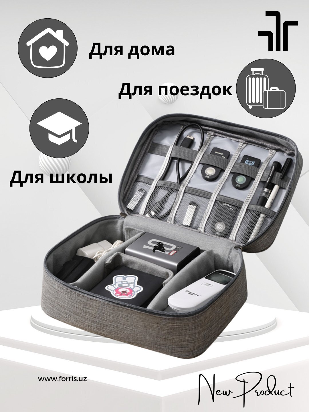 ✔ Aqlli tartib — ichki boʻlinmalar va choʻntaklar zaryadlovchi qurilmalar, kabel, quloqchin, fleshkalar, xotira kartalari va boshqa aksessuarlarni tartibli saqlash imkonini beradi.